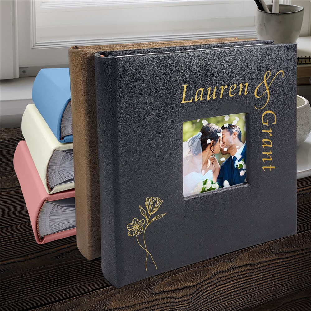 Soft, simple, and beautifully modern — this Engraved Floral Names Leatherette Photo Album features a delicate flower-outline motif and your names elegantly engraved. Perfect for storing photos from your wedding day, bridal shower, or engagement shoot. Available in all album colors for the perfect match.