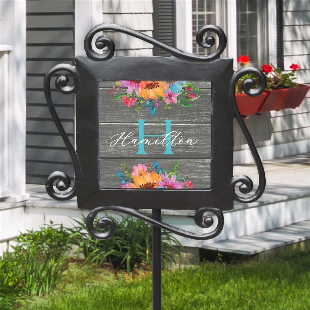 Personalize this colorful floral garden stake with any initial and family name. This garden stake will look beautiful displayed in any outdoor space!