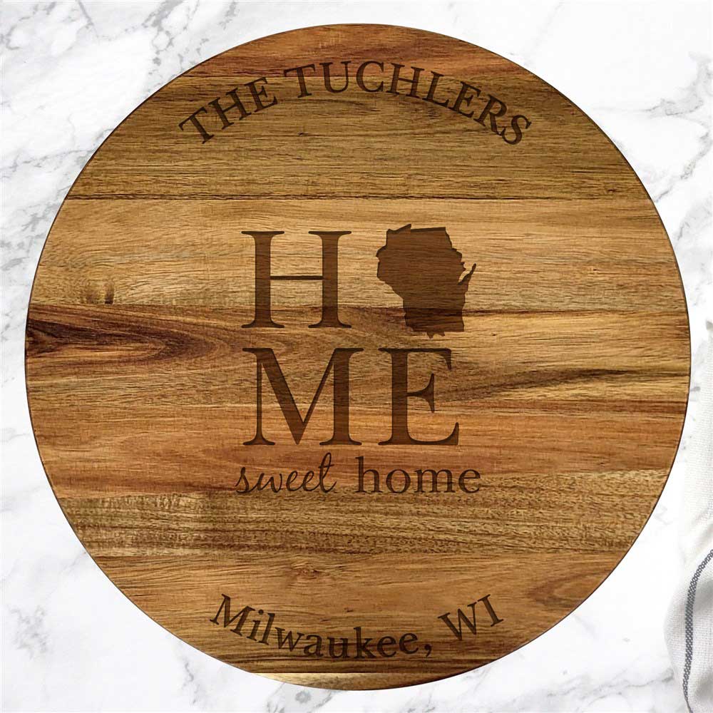 Give your kitchen an update with our Engraved Home Sweet Home Lazy Susan! This turntable can be personalized with any state, custom message line, and city and state. Perfect for spices, seasonings, and other cooking essentials!