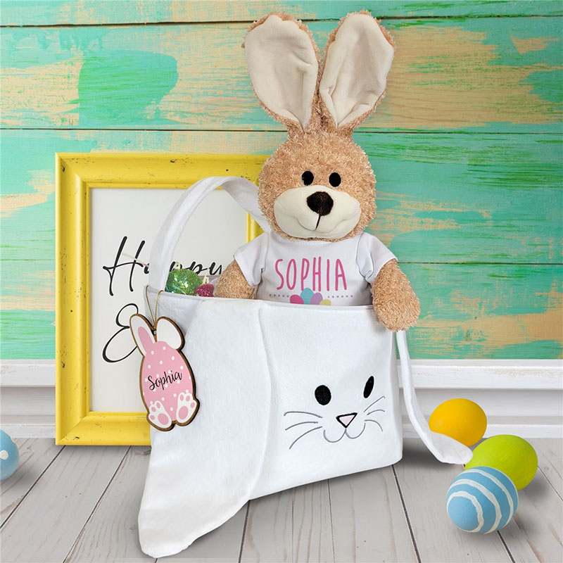 This set includes a cute plush bunny basket to fill with goodies, a basket tag to add on to the basket, and an adorable plush bunny wearing a personalized t-shirt.