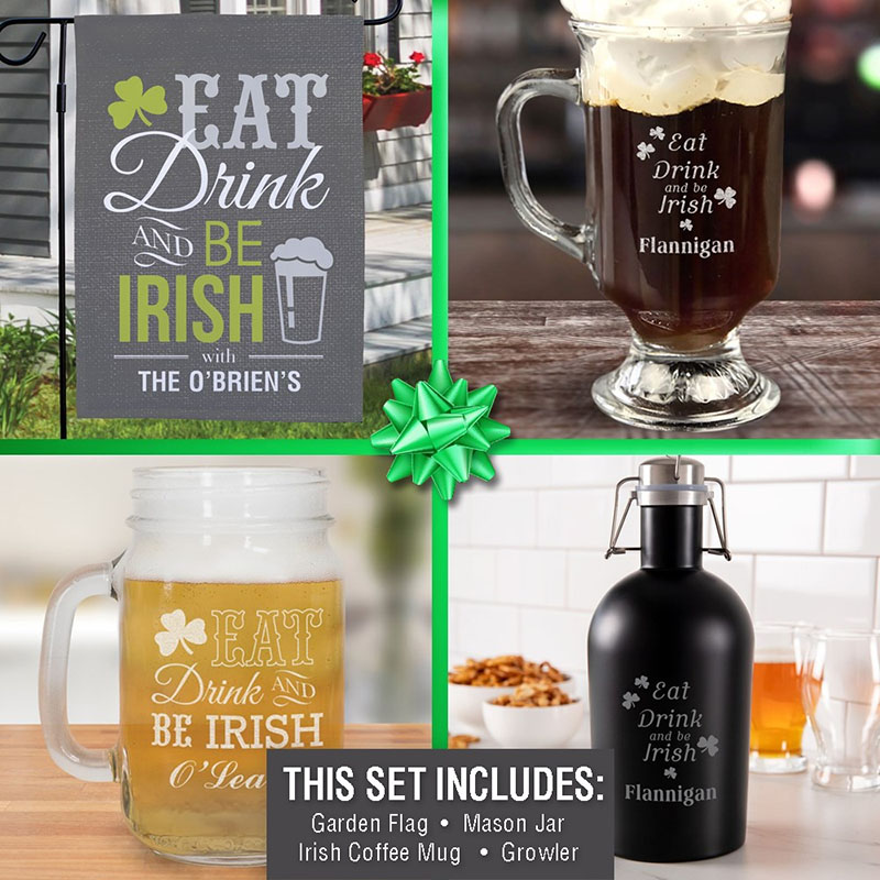 This Irish-themed bundle lets you show off your shamrock side with pride. The custom garden flag is fantastic weather it’s in the front or back yard. Both the glass mason jar and the Irish Coffee mug can tackle any cold beverage of choice, with the growler keeping that chaser nice and cold.