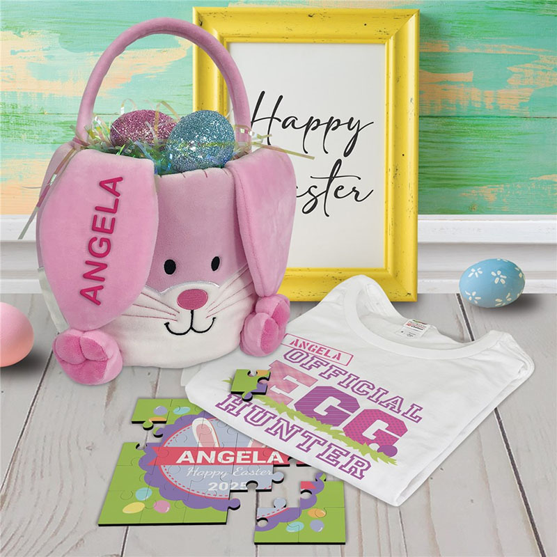 This set includes a cute plush bunny basket, a t-shirt for them to wear while hunting for Easter eggs and a puzzle with their name on it.