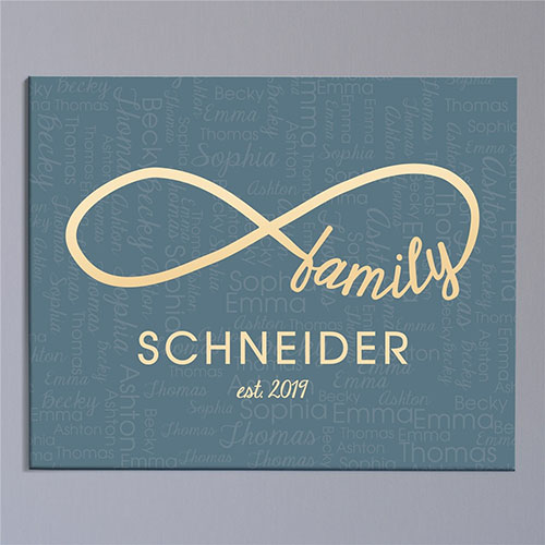 Add a touch of love for your family to your wall with a Personalized Infinity Wall Canvas.We will personalize with any family name and any custom message line, along with family members names, on this item created by our word-art tool, to make a unique wall hanging you will love for years to come.Give as a gift to all family and friends!